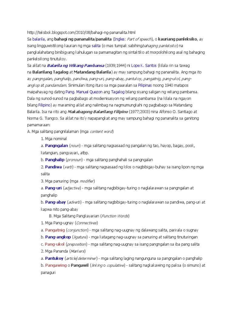 Ang bahagi ng pananalita (part of speech)ay isang lingguwistikong kauriang panleksiko ng mga salita o bahaging panleksiko na pangkalahatang binibigyang kahulugan sa pamamagitan ng morpolohikong asal. ( part of speech ). Mayroong sampung bahagi ng pananalita sa filipino. In english, the main parts of speech are noun, pronoun, adjective, determiner, verb, adverb, preposition, conjunction. Ano ang mga bahagi ng pananalita?